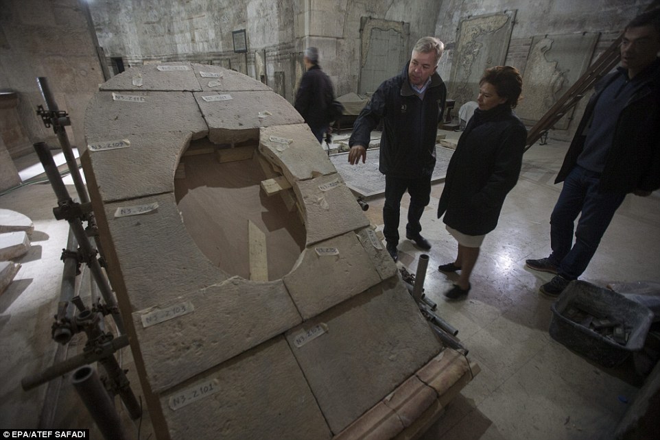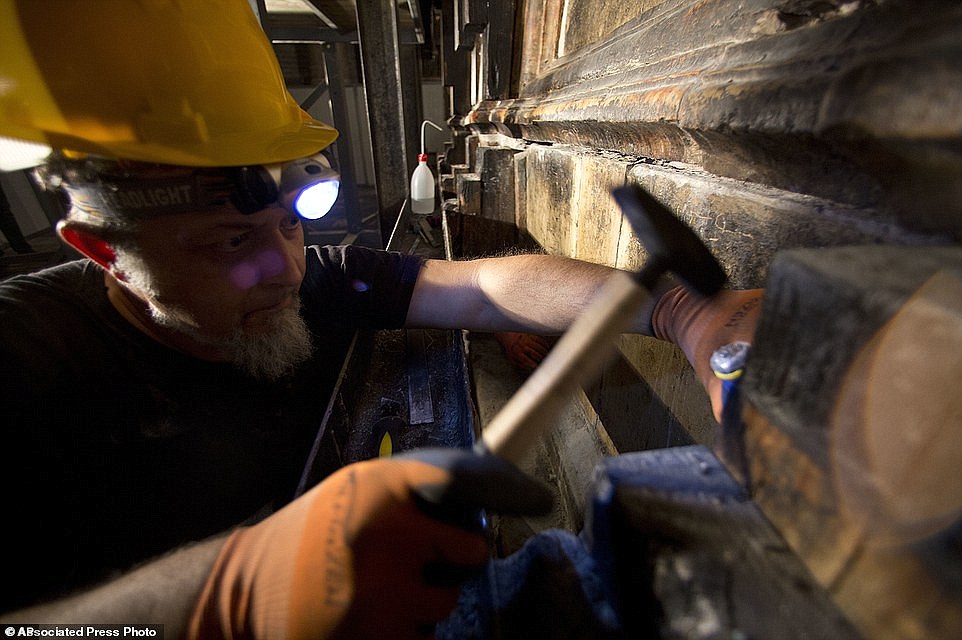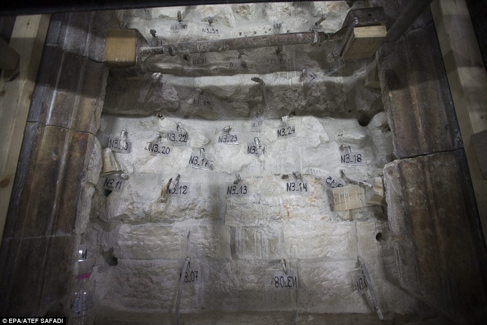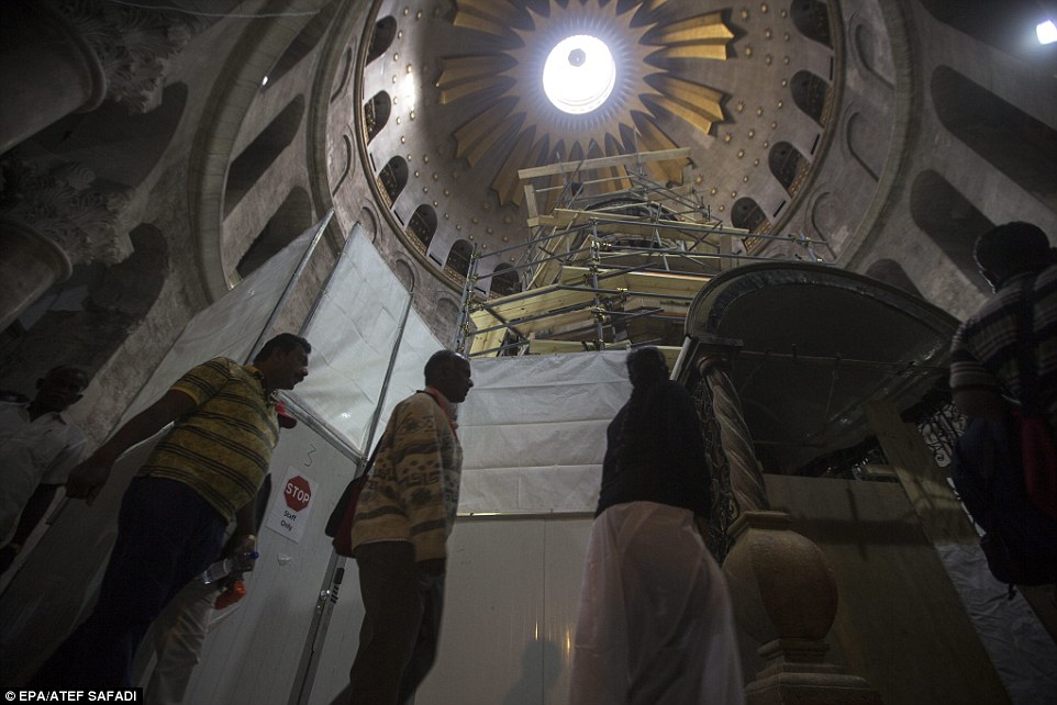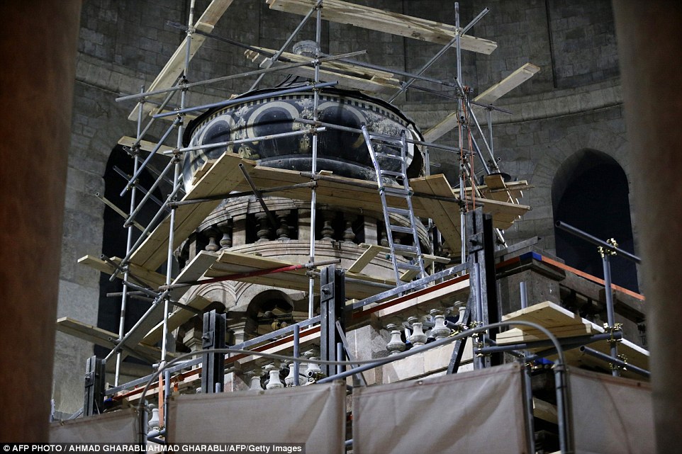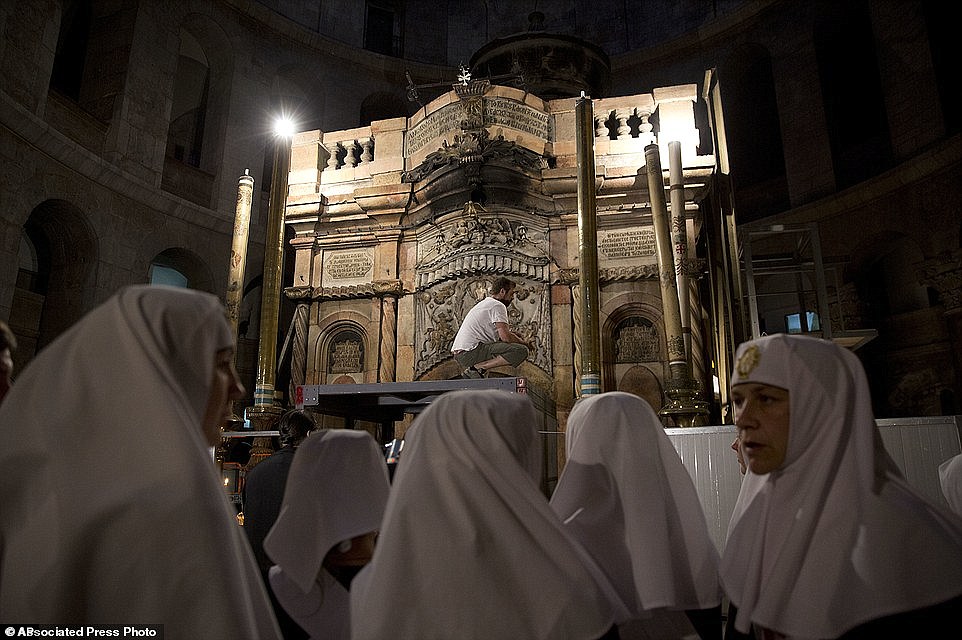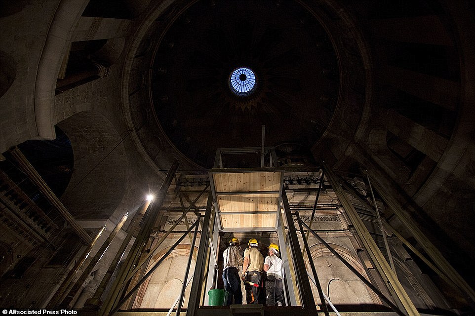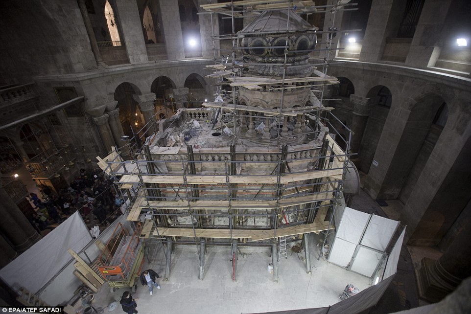 Now, new images have emerged revealing the restoration work on the stones that cover the outside of the tomb as well as an 18th century shrine known as the 'Edicule'.