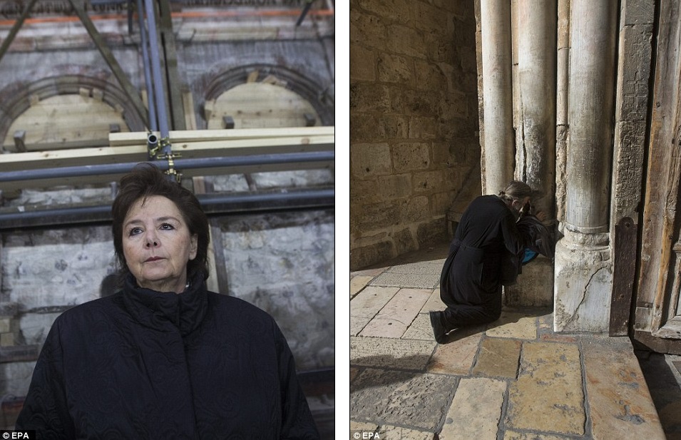 Antonia Moropoulou, professor at the National Technical University of Athens and the Chief Scientific Coordinator of the restoration project, shown left. A Christian pilgrim praying outside the Church, shown right