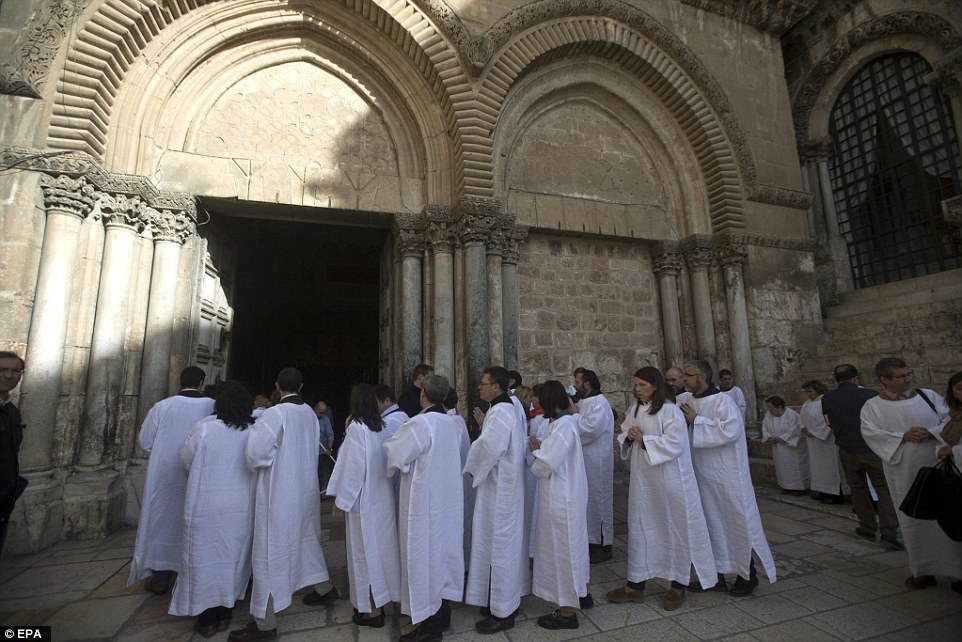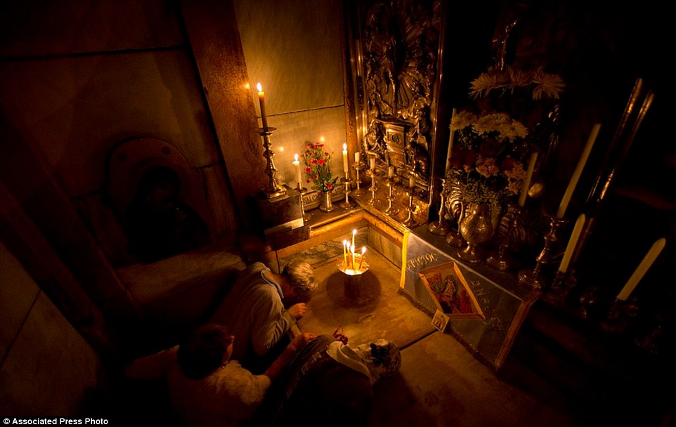 Christian pilgrims pray outside the Church of the Holy Sepulchre. Christian tradition says Christ's body was laid on a slab cut from a limestone cave after his crucifixion by the Romans