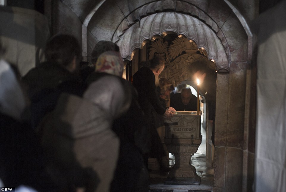 Christian tradition says Christ's body was laid on a slab cut from a limestone cave after his crucifixion by the Romans more than two thousand years ago. This slab had been encased in marble since at least 1555 AD. Worshippers are pictured praying to the slab underneath the marble casing, before it was uncovered
