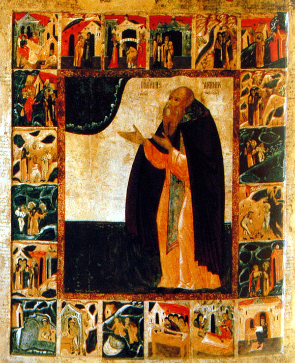 You renounced the world in favor of the spirit, / Seeking the one God with your whole heart, O Anthony. / You retreated to a far wilderness, near waters, / In tears and labors living the angelic life. / You gathered a multitude of monks in your wisdom. / Visit them and cease not to implore the Holy Trinity / To deliver us from evil / And to save our souls!